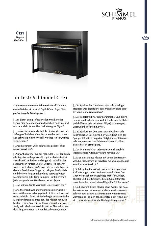 Auf der NAMM Show 2020 in Kalifornien testete das in den USA ansässige und international weit verbreitete Piano Magazin „Piano Buyer“ unser neues Klaviermodell Cassic 121. In der Ausgabe des Magazins vom Frühling 2020 ist die positive Rezension erschienen, über die wir uns sehr freuen. Eine Zusammenfassung können Sie unter Downloads nachlesen.